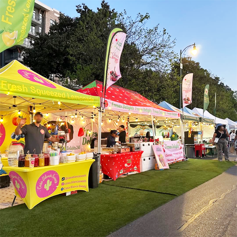 Sizzling Brand Presence: Gourmet Food Festival "We helped vendors stand out in a crowded marketplace with a cohesive branding package. Our custom canopy tents provided a professional storefront, while matching custom table covers and vibrant feather flags created a 360-degree brand experience. Designed to be oil-resistant and easy to clean, our products ensured that the focus stayed on the food while the brand stayed front and center."